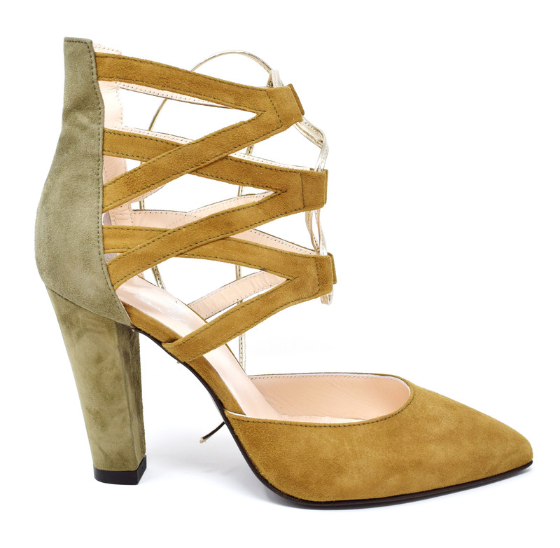 2 tone sand taupe and olive suede caged heel with silver lace up detail