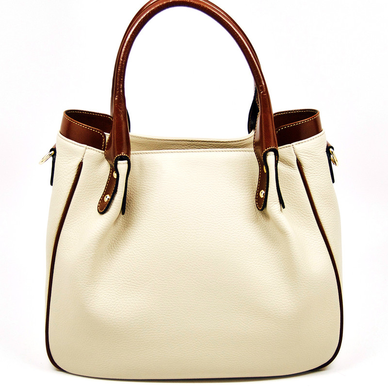 Beautifully constructed bag, perfect for everyday use. It features two short handles and removable shoulder strap. The handles are attached to the bag in a way that it gives it a gripping clamps look. Top zipper closure. Interior features a center zippered pocket allowing separation of the main two compartments. Fully lined in jacquard material. It has a wall zippered pocket and two additional open pockets.